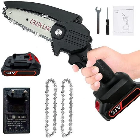 【Ce que vous obtiendrez】 – Livré avec 1 mini-tronçonneuse portative, 1 déflecteur nouvellement conçu, 2 scies à chaîne de haute qualité, 1 batteries au lithium amovibles de grande capacité 24 V, 1 bloc d’alimentation de charge, 1 tournevis, 1 petite clé, 1 paire de gants et 1 manuel d’installation. Veuillez noter: vous devez garder un œil sur le serrage de la chaîne, il est normal que la chaîne glisse après le travail