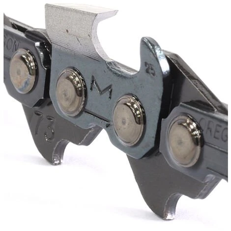 Chaîne semi-chisel à dents tranchantes légèrement arrondies et coupe étroite. Revêtement chromé renforcé sur les dents tranchantes pour une prolongation significative de la durée de vie.