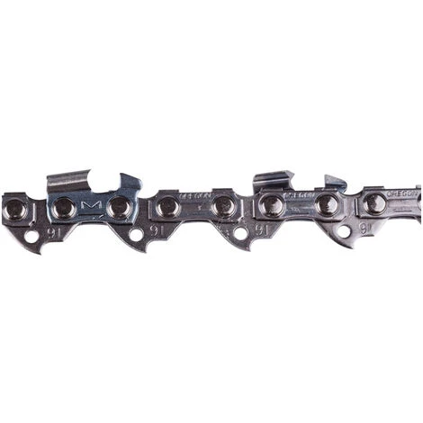 Chaîne semi-chisel à dents tranchantes légèrement arrondies et coupe étroite. Revêtement chromé renforcé sur les dents tranchantes pour une prolongation significative de la durée de vie.