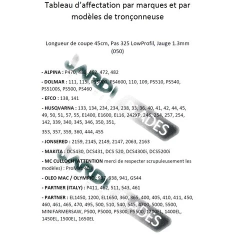 Combo Oregon comprenant un guide 180MLBK095 et deux chaines 95TXL072E, longueur de coupe de 45cm, Pas 325LP (Low profil), Jauge 1.3mm (050) chaines avec 72 maillons entraineurs (dents qui entrent dans le guide) Ce guide se monte essentiellement sur les marques de tronçonneuse Alpina, Dolmar, EFCO, Husqvarna, Jonsered, Makita, Mc Culloch, Oleo Mac, Olympic et Partner (voir tableau d’affectation par marque et modèle en photo) ATTENTION : Merci de respecter notre tableau d’affectation en photo sur la fiche produit, ce guide utilise des chaines spécifiques Oregon à gouges étroites (325 Low Profil) pour une coupe plus rapide.