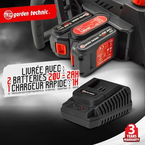 Livré avec 2 batteries lithium 20V – 2Ah et un chargeur rapide 1H.