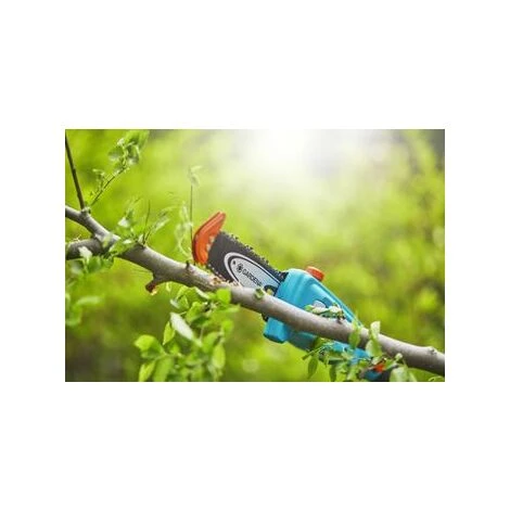 L’élagueuse sur perche sans fil GARDENA est équipée d’une butée de coupe, d’une bandoulière et d’un réservoir d’huile d’une capacité de 60 ml.