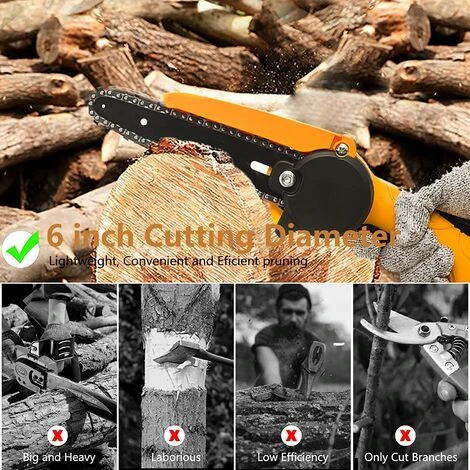 【Design Ergonomique】La mini tronçonneuse est traitée avec une poignée recouverte de caoutchouc noir,qui ne fatigue pas à tenir longtemps,absorbe les chocs et est antidérapante.Verrouillage enfant,travail en toute sécurité.La conception du trou de refroidissement de la batterie de la mini tronçonneuse peut accélérer la dissipation de la chaleur,équipée de perles de,adaptées au nuit.Portable tronçonneuse électrique est munies d’un capot de sécurité pour éviter les envolées de sciure.