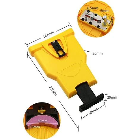【Facile à utiliser】 : ouvrez l’affûteur, installez la tronçonneuse sur les deux trous, fermez l’affûteur. Lors de l’affûtage du couteau, poussez doucement l’extrémité du guide-chaîne jusqu’à ce que la scie touche la pierre à aiguiser.