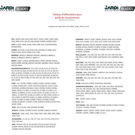 Guide Oregon 120SDEA041 pour tronçonneuse d’une longueur de coupe de 30cm. Pas 3/8LP, Jauge 1.3mm. Ce guide s’adapte essentiellement sur les tronçonneuses de marques et modèles : Voir tableau d’affectation en photo sur la fiche produit Ce guide se monte généralement avec une chaîne de 44 maillons entraineurs (dents qui entrent dans le guide), chaîne disponible en stock. Merci de respecter nos préconisations ou de nous contacter en cas de doute. Combo Oregon 120SDEA041 1 guide + 2 chaines également disponible en stock