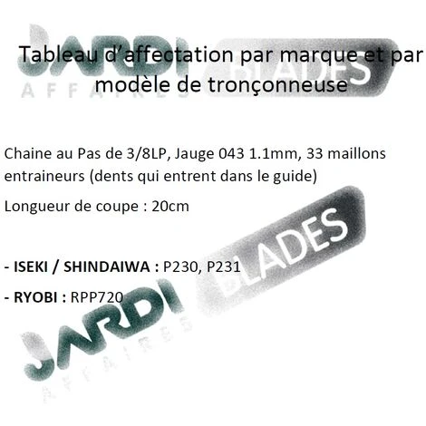 Chaîne Professionnelle 20cm pour tronçonneuse élagueuse, Pas 3/8, jauge 043/1,1mm, 33 Entraineurs. Correspondance Oregon 90-33E. Cette chaîne pour tronçonneuse de 20 cm se monte sur Ryobi RPP720 et Iseki ou Shidaiwa P230, P231. Voir tableau d’affectation par marque et modèle en photo ou nous contacter pour vérifier avant commande.
