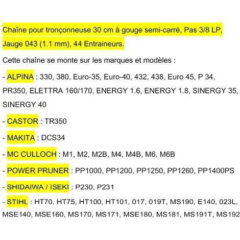 Chaîne de qualité 30 cm de coupe pour tronçonneuse, Pas 3/8, jauge 043 soit 1,1mm, 44 maillons entraineurs. Correspondance Oregon 90-44E, 90P044E ou 90PX044E. Cette chaîne pour tronçonneuse de 30 cm se monte sur Stihl, Alpina, Castor, Makita, Mc culloch, Power Pruner, Shindaiwa, Iseki. Autres marques ou modèles nous contacter. Voir tableau d’affectation par marque et modèle en photo ou nous contacter pour vérifier avant commande. ATTENTION : Ne convient pas aux tronçonneuses Stihl sans fil