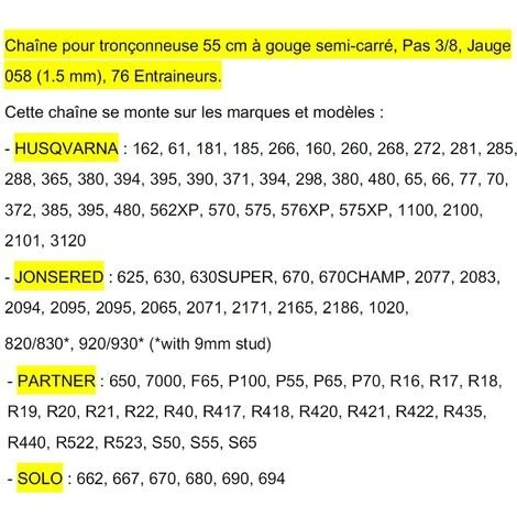 Chaîne Professionnelle 40cm pour tronçonneuse, Pas 3/8, jauge 050/1,3mm, 54 Entraineurs. Correspondance Oregon 91-54E. Cette chaîne pour tronçonneuse de 40 cm se monte sur Einhell, John Deere, Mc Culloch, Partner, Remington et Talon. Voir tableau d’affectation par marque et modèle en photo ou nous contacter pour vérifier avant commande.