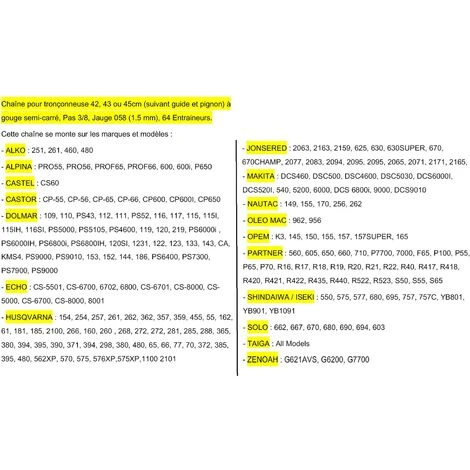 Chaîne Professionnelle 42, 43 ou 45 cm (suivant guide et nombre de dents du pignon) pour tronçonneuse, Pas 3/8, jauge 058/1,5mm, 64 Entraineurs. Correspondance Oregon 73-64E. Cette chaîne pour tronçonneuse de 42, 43 ou 45 cm se monte sur Dolmar, Husqvarna, Jonsered, Partner, Iseki, Shindaiwa, Solo, Zenoah, Taiga, Opem, Oleo Mac, Nautac, Makita, Echo, Castor, Castel, Alpina et Alko. Autres marques ou modèles nous contacter. Voir tableau d’affectation par marque et modèle en photo ou nous contacter pour vérifier avant commande.