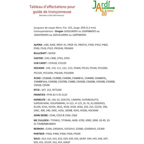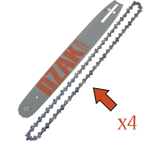 Ensemble comprenant 1 guide Pro 40cm + 4 chaînes de tronçonneuse Pas .325, Jauge 1.3mm (050), 66 maillons entraineurs. Correspondances Oregon : Guide 160SLGK095 ou 160RNBK095 ou 160ATMK095 ou 160VXLGK095 ou 160PXBK095, Chaîne 20-66E. se monte principalement sur les tronçonneuses Homelite, Solo, Alpina, Bullcraft, Castor, Frontier, John Deere, Redmax, Partner, Cub Cadet, Efco, et Mc Culloch. Voir tableau d’affectation en photo. Découvrez également nos offres 1 guide + 1 chaine ou guide seul.