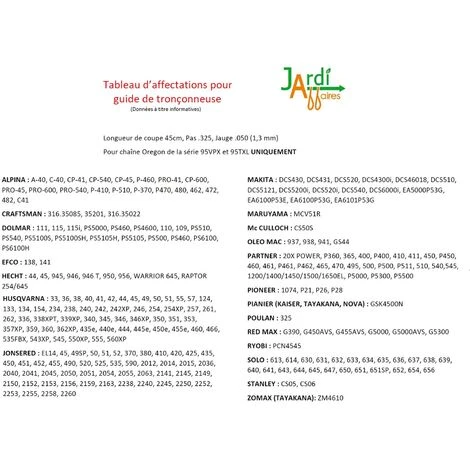 Ensemble Oregon comprenant 1 guide de 45cm 180TXLBK095 + 2 chaines Oregon 95TXL072E Pas 325, Jauge 1,3mm avec 72 maillons entraineurs Low Profil (gouge étroite). Convient aux tronçonneuses ALPINA, CRAFTSMAN, DOLMAR, EFCO, HECHT, HUSQVARNA, JONSERED, MAKITA, MARUYAMA, OLEO MAC, PARTNER, PIONEER, PIANIER, RED MAX, RYOBI, SOLO, STANLEY, ZOMAX suivant tableau d’affectation en photo. Peut se monter à la place du guide 180TXLGK095 dont la roulette est plus grande 12 dents au lieu de 10 (nez étroit) pour le modèle 180TXLBK095. ATTENTION : Voir tableau d’affectation en photo