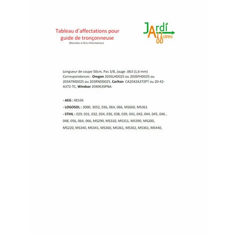 Ensemble guide avec chaîne pour tronçonneuse professionnel longueur 50cm 72 entraineurs pas 3/8 jauge 0.63 (1.6mm) remplace les guides Oregon 203SLHD025 ou 203SFHD025 ou 203ATMD025 ou 203RNDD025, Carlton CA2042A372PT ou 20-42-A372-TC, Windsor 204063SPNA et la chaine 75-72E, ce guide et cette chaîne se monte principalement sur les tronçonneuses Stihl, AEG et Logosol. Voir tableau d’affectation en photo. Guide seul disponible ou en Combo 4 chaînes 72 maillons entraineurs.