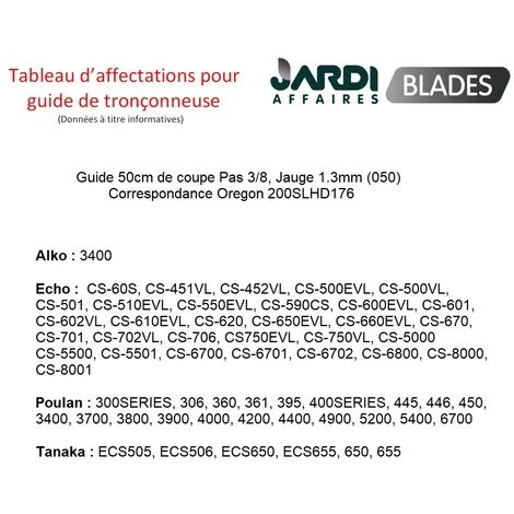 Guide Ozaki pour tronçonneuse, longueur de coupe 50cm, Pas 3/8, Jauge 1.3mm (050) livré avec 1 chaine de 70 maillons. Ce guide remplace la référence Oregon 180SLHD176 et se monte sur les marques de tronçonneuse Alko, Echo, Poulan et Tanaka (voir tableau d’affectation des modèles en photo). Guide également vendu seul ou plusieurs chaines (2, 3 ou 4 chaines) à un tarif avantageux. ATTENTION : Merci de respecter nos affectations (tableau en photo sur la fiche produit) et de vous assurer du Pas (3/8) et de la Jauge (1.3mm) de votre montage d’origine (plusieurs montages possibles pour les modèles de tronçonneuse cités)