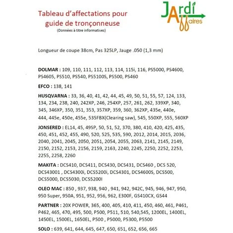 Guide Oregon 150MLBK095 longueur de coupe (pas longueur totale) 38cm, Pas 325LP, Jauge 1,3mm Ce guide est uniquement monté avec une chaine Oregon 95TXL064E avec 64 maillons entraineurs (non fournie). Se monte essentiellement sur (VOIR tableau d’affectation en photo) Dolmar, Efco, Husqvarna, Jonsered, Makita, Oleo Mac, Solo et Partner ATTENTION : Merci de respecter notre tableau d’affectation (en photo) ou de nous contacter en cas de doute Également disponible en stock en Combo (avec 2 chaines) à un prix très compétitif.