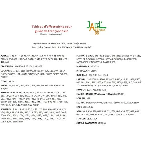 Guide Oregon 150TXLBK095 longueur de coupe 38cm, Pas 325 Microlite, Jauge 1,3mm généralement monté avec une chaine de 64 maillons entraineurs (dents qui entrent dans le guide). Convient aux tronçonneuses ALPINA, CRAFTSMAN, DOLMAR, EFCO, HECHT, HUSQVARNA, JONSERED, MAKITA, MARUYAMA, OLEO MAC, PARTNER, PIONEER, PIANIER, RED MAX, RYOBI, SOLO, STANLEY, ZOMAX… ATTENTION : Merci de respecter notre tableau d’affectation (en photo), convient UNIQUEMENT à de la chaine Microlite (gouge étroite Oregon) Peut se monter à la place du guide 150TXLGK095 dont la roulette est plus grande (nez large) avec 12 dents.