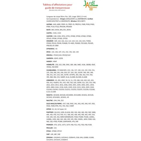Guide 50cm professionnel pour tronçonneuse Pas .325, Jauge 1,5mm (.058) correspondances Oregon 208SLGK095 ou 208RNBK095. Ce guide se monte principalement sur les tronçonneuses Alpina, Dolmar, Husqvarna, Jonsered, Makita, Partner,Ole Mac, Opem, Pioneer, Zenoah, Poulan, VAP, Stiga, Homelite, Garden, Einhell, Efco, Dynamac, Castor et Blitz. Voir tableau d’affectation en photo. Disponible en Combo avec 1 chaine ou Combo 4 chaînes 78 maillons entraineurs. Voir tableau d’affectation en photo ou nous contacter en cas de doute.