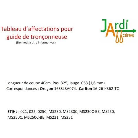 Guide semi-professionnel pour tronçonneuse longueur de coupe 40cm Pas .325 Jauge 0.63 (1.6mm) correspondances Oregon 163SLBA074, 163PXLBA074, Carlton 16-26-K362-TC. Ce guide pour tronçonneuse se monte uniquement sur les machines de la marque STIHL. ATTENTION : Merci de respecter notre tableau d’affectation des modèles en photo, pour les modèles indiqués montage en 3/8LP ou 325 merci de vous assurer du Pas de chaine de votre pignon. Modèle également disponible en Combo (1 guide + 4 chaines 62 maillons entraineurs) ou 1 guide + 1 chaine 62 maillons entraineurs.