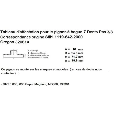 Pignon Professionnel pour tronçonneuse Stihl, entrainement à 7 Dents, Pas de chaîne 3/8 063 (1,6 mm). Correspondance Oregon 32061X, origine Stihl 1119-642-2000. Ce pignon pour tronçonneuse Stihl se monte en lieu et place du modèle d’origine sans aucune modification. Voir notre tableau d’affectation en photo ou nous contacter.