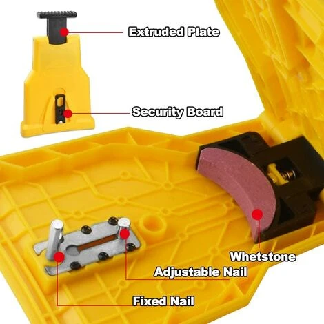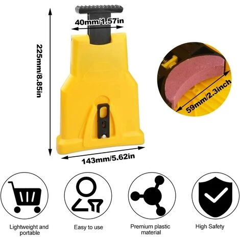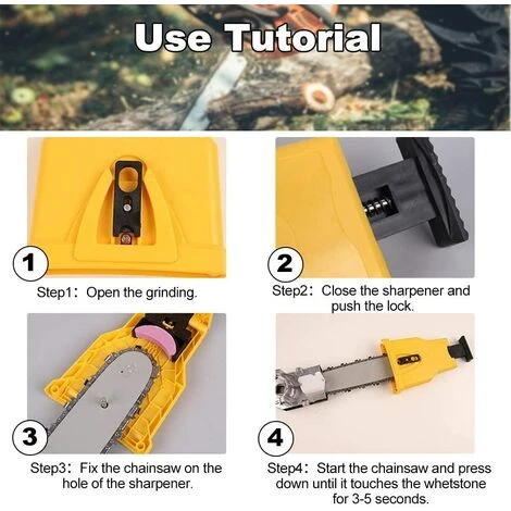 Facile utiliser: L’affteur est trs facile utiliser. Tout d’abord, installez la trononneuse dans les deux trous de l’affteur. Pendant ce processus, vos mains n’ont pas besoin de toucher la pierre aiguiser pour protger vos mains des blessures. Puis fermez et verrouillez l’affteur. Enfin, serrez lgrement la scie pour affter la scie en quelques secondes.