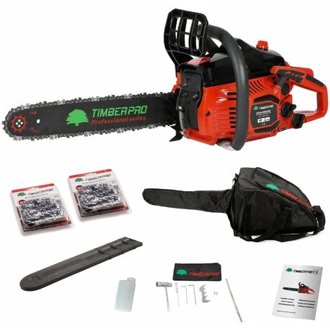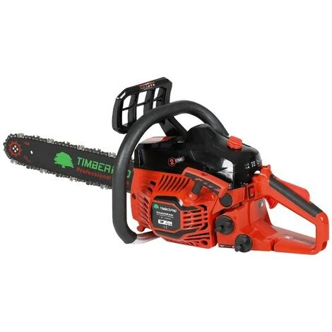 Tronçonneuse thermique 38,2 cm3, guide 40 cm avec 2 chaines + une housse de transport et accessoires- L’un des meilleurs rapport qualité prix du segment. Vous serez surpris par sa puissance et ces capacités.- Idéal pour des travaux d’abattage d’arbre et de coupe de petite et moyenne section. Elle dispose d’un lanceur démultiplié, d’une pompe d’amorçage et d’un starter pour faciliter le démarrage.Caractéristiques techniques *: – Vendeur PRO français, SAV en France- Moteur : monocylindre 2 temps refroidi par air- Homologation : CE, GS, TÜV, Safety Net, EUII- Cylindrée : 38,2 cm3- Puissance : 1,9 CV à 8500 tr/min- Régime moteur maxi : 10500 tr/min- Longueur du guide : 40 cm (16 pouces)- Chaîne : 66 maillons – 325 »-1,5 mm- Tendeur de chaine latéral- Graissage de la chaîne : Automatique par pompe à huile, débit réglable- Dispositif de démarrage lanceur à prise direct et starter- Carburant : Mélange de SP95 ou 98 + 4% d’huile 2 Temps de synthèsePas de SP95 E10 ni de mélange alkylate- Embrayage type centrifuge- Système anti vibration sur ressort silent bloc- Dispositif de sécurité : frein de chaine, attrape chaine, poignée antidérapante- Huile de chaine : Type filante et collante, privilégiez la qualité au prix – Volume du réservoir d’essence : 550 ml- Volume du réservoir d’huile : 260 ml- Poids : 5.4kg (sans guide et chaine)- Notice en FrançaisContenu du colis :- Tronçonneuse 38,2 cm3- 2 X Chaînes affûtées – Housse de transport avec sangle- Bidon pour mélange- Pochette outil avec Clé à bougie, tournevis et lime- Protège guideGarantie et livraison :- Garantie : 2 ans pour les particuliers- Pièces de rechange en stock permanent- Livraison rapide*données fabricant